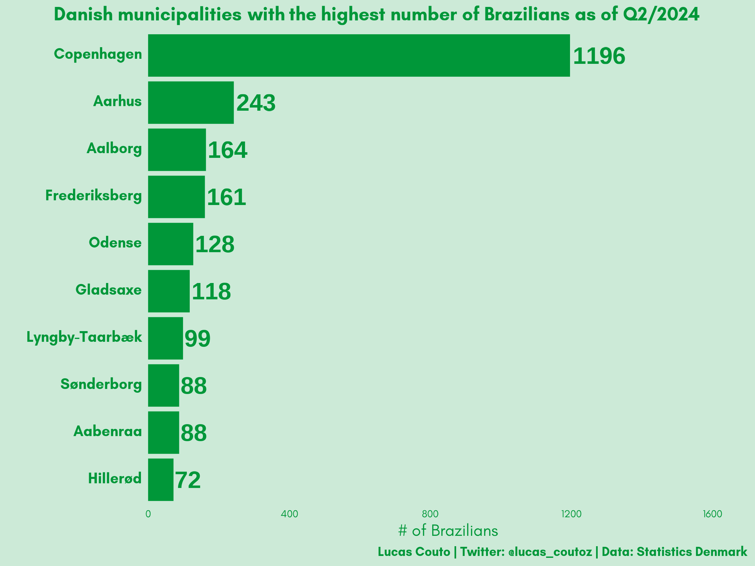 Not surprisingly, this order almost repeats when we look exclusively at the dispersion of Brazilian immigrants. The difference is that Odense falls to the 5th place, while Aalborg comes in 3rd and Frederiksberg in 4th.