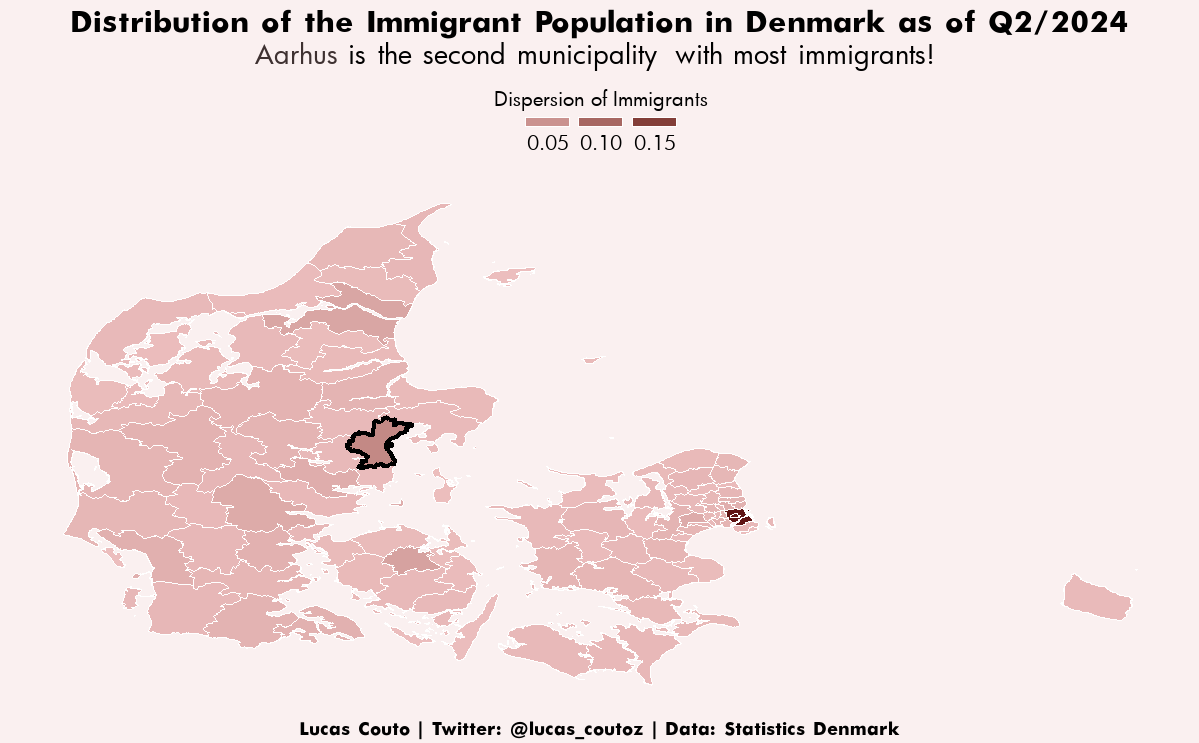 ##before you proceed, you should download the data from https://www.dst.dk/en/Statistik/emner/borgere/befolkning/befolkningstal#Load packageslibrary(ggtext)library(mapDK)library(ragg)library(readxl)library(showtext)library(sf)library(tidyverse)#Data Wranglingimmigration <-read_xlsx("20248323147475147100FOLK1B.xlsx") %>% janitor::clean_names() %>%select(x3, x4, x5) %>%filter(x5 !="2024Q2") %>%fill(x3, .direction ="down") %>%mutate(x5 =as.numeric(x5)) %>%filter(x4 !="Total") %>%filter(x4 !="Denmark") %>%mutate(total =sum(x5)) %>%group_by(x3) %>%mutate(per_mun =sum(x5),per_per = per_mun/total) %>%ungroup() %>%select(-x4, -x5) %>%unique() %>%arrange(desc(per_per)) %>%mutate(id =tolower(x3),id =str_replace_all(id, "ø", "oe"),id =str_replace_all(id, "-", " "),id =str_replace_all(id, "æ", "ae"),id =str_replace_all(id, "å", "aa")) %>%mutate(id =ifelse(id =="copenhagen", "koebenhavn", id))subset_im <- immigration %>%select(id, per_per)mapdk <-mapDK()$data %>%left_join(subset_im, by ="id")mapdk1 <- mapdk %>%select(id) %>%unique()mapdk_sf <-st_as_sf(mapdk, coords =c("long", "lat"), crs =4326)#Fontfont_add(family ="regular", "Futura Book.ttf")font_add(family ="bold", "Futura Bold.ttf")showtext_auto() #plotdk <-mapDK(values ="per_per", id ="id", data = mapdk) +scale_fill_gradient(low ="#ecbebe", high ="#5f1313",name ="Dispersion of Immigrants",guide =guide_legend(title.position ="top",nrow =1,keyheight =unit(3, units ="mm"),keywidth =unit(12, units ="mm"),label.position ="bottom")) +geom_polygon(data = mapdk, aes(x = long, y = lat, group = group, fill = per_per), color ="white") +geom_polygon(data = mapdk %>%filter(id =="aarhus"), aes(x = long, y = lat, group = group), fill =NA, color ="black", linewidth =1.5) +coord_sf(expand = T) +labs(title ="Distribution of the Immigrant Population in Denmark as of Q2/2024",subtitle ="<span style='color:#3e3131'>**Aarhus**</span> is the second municipality with most immigrants!",caption ="Lucas Couto | Twitter: @lucas_coutoz | Data: Statistics Denmark") +theme(##Title, Subtitle, Captionplot.title =element_text(family ="bold", hjust =0.5, vjust =0.5, size =25, color ="black"),plot.title.position ="plot",plot.subtitle =element_markdown(family ="regular", hjust =0.5, vjust =0.5, size =20, color ="black"),plot.caption =element_text(family ="bold", size =15, color ="black", hjust =0.5, vjust =0.5),plot.caption.position ="plot",##Backgroundpanel.border =element_blank(),panel.grid.major =element_blank(),panel.grid.minor =element_blank(),plot.background =element_rect(fill ="#faf0f0", linetype ='blank'),#plot.margin = margin( , 0.5, , , "cm"),panel.background =element_rect(fill ="#faf0f0"),##Axesaxis.text =element_blank(),axis.ticks =element_blank(),##Legendlegend.title =element_text(family ="regular", size =15, hjust =0.5, vjust =0.5),legend.position ="top",legend.background =element_rect(fill ="#faf0f0"),legend.text =element_text(family ="regular", size =15),legend.key =element_rect(fill ="#faf0f0"))#size: 12x8#Data Wrangling IIbra <-read_xlsx("20248323147475147100FOLK1B.xlsx") %>% janitor::clean_names() %>%select(x3, x4, x5) %>%filter(x5 !="2024Q2") %>%fill(x3, .direction ="down") %>%mutate(x5 =as.numeric(x5)) %>%filter(x4 =="Brazil") %>%arrange(desc(x5)) %>%slice(1:10) %>%mutate(x3 =fct_reorder(x3, x5))#Fontfont_add(family ="regular", "GlacialIndifference-Regular.otf")font_add(family ="bold", "GlacialIndifference-Bold.otf")showtext_auto() bra_imt <- bra %>%ggplot(aes(x3, x5)) +geom_bar(stat ="identity", width =0.9, fill ="#009739") +geom_text(aes(x = x3, y = x5, fontface =2, label = x5), position =position_dodge(width =1), colour ="#009739", hjust =-0.08, size =20) +ylim(0, 1700) +coord_flip(expand =FALSE) +labs(title ="Danish municipalities with the highest number of Brazilians as of Q2/2024",x ="",y ="# of Brazilians",caption ="Lucas Couto | Twitter: @lucas_coutoz | Data: Statistics Denmark") +theme(#Title, Subtitle, Captionplot.title =element_markdown(family ="bold", hjust =0.5, vjust =0.5, size =45, color ="#009739"),plot.title.position ="plot",plot.subtitle =element_markdown(family="regular", size =25, hjust =0.5, color ="#009739"),plot.caption =element_text(family="bold", size =30, color ="#009739", hjust =1),plot.caption.position ="plot",#Panel and Backgroundpanel.border =element_blank(),panel.grid.major =element_blank(),panel.grid.minor =element_blank(),panel.background =element_rect(fill ="#ccead7"),plot.background =element_rect(fill ="#ccead7", linetype ='blank'),#Axesaxis.title =element_text(size =40, family ="regular", color ="#009739"),axis.text.y =element_markdown(size =35, family ="bold", color ="#009739"),axis.text.x =element_text(size =25, family ="regular", color ="#009739"),axis.ticks =element_blank(),axis.line =element_blank(),#Plustext =element_text(family ="regular", size =45),legend.position ="none")ggsave("bra_imt.png",plot=bra_imt,device =agg_png(width =8, height =6, units ="in", res =300))