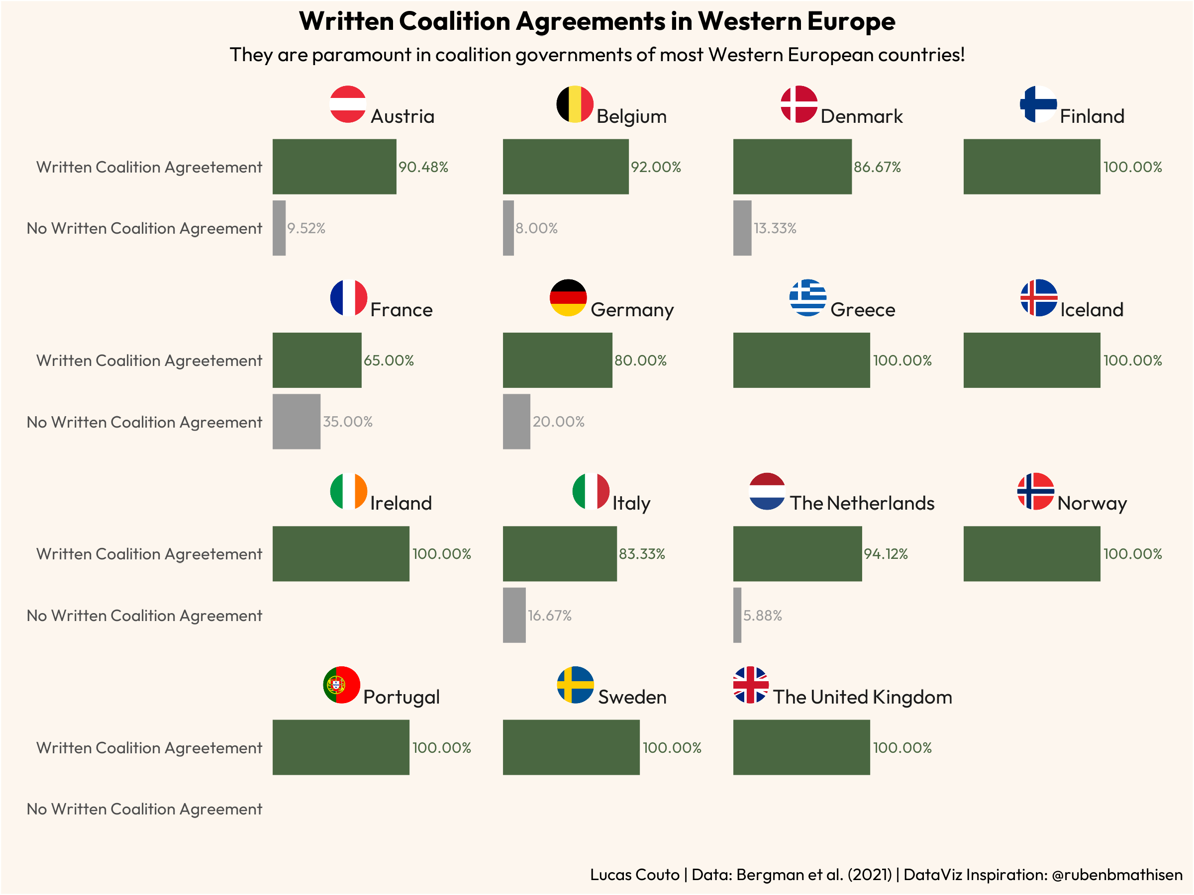 In any case, the central point to me is that not all democracies have coalition governments with the habit of disclosing written coalition agreements. To the best of my knowledge, there are only a few instances of written coalition agreements in presidential democracies, for example. Thus, my aim with the below graphical representation from a PolSci perspective is to see to what extent coalition governments put down the terms of the multiparty deal in Western Europe. I also bear in mind that, while there are several beautiful visualisations about research topics within PolSci, such as Andrew Heiss’ graphs on NGOs and Ruben Mathisen’s graphs on inequality, there are very few exemplars of graphs related to coalition politics in social media.